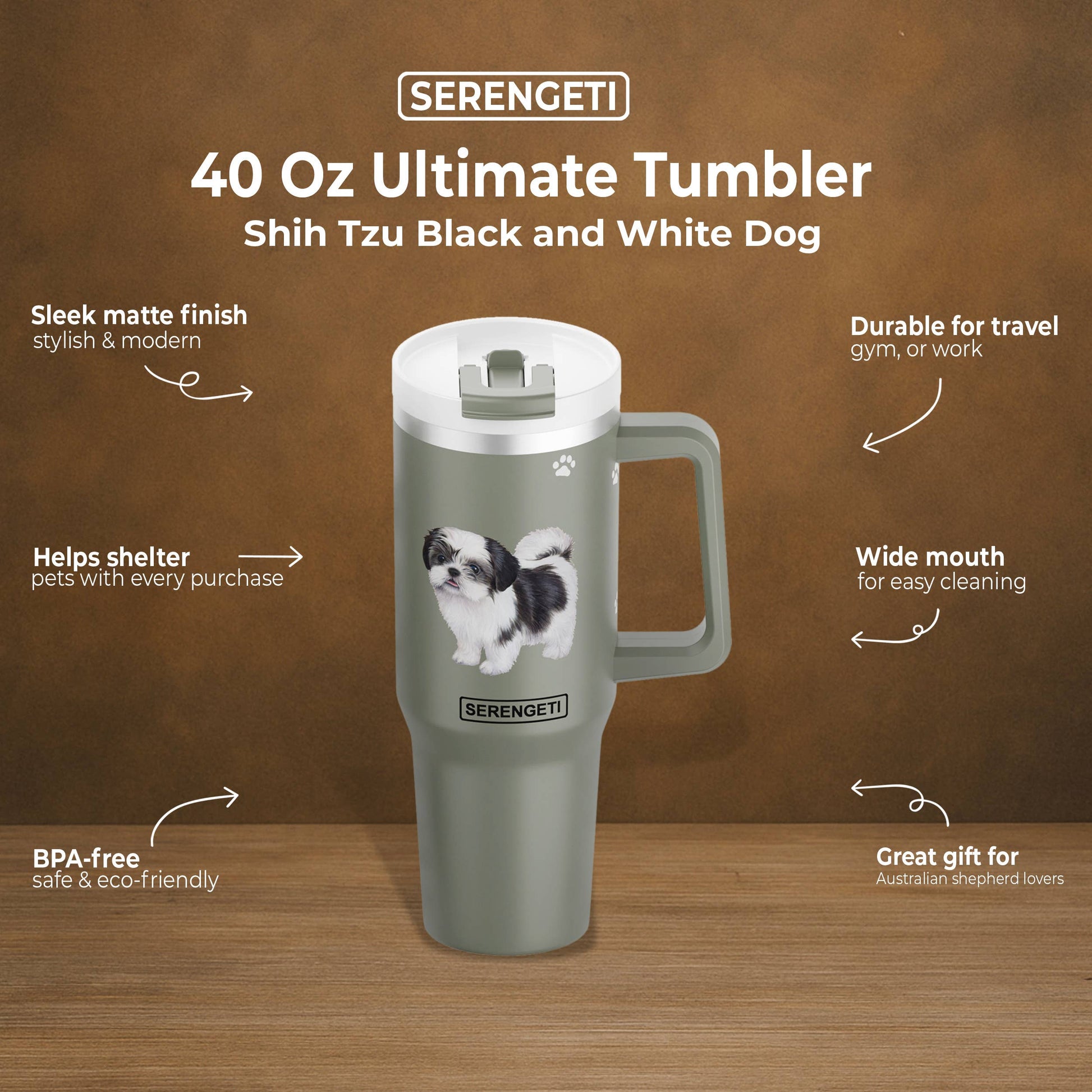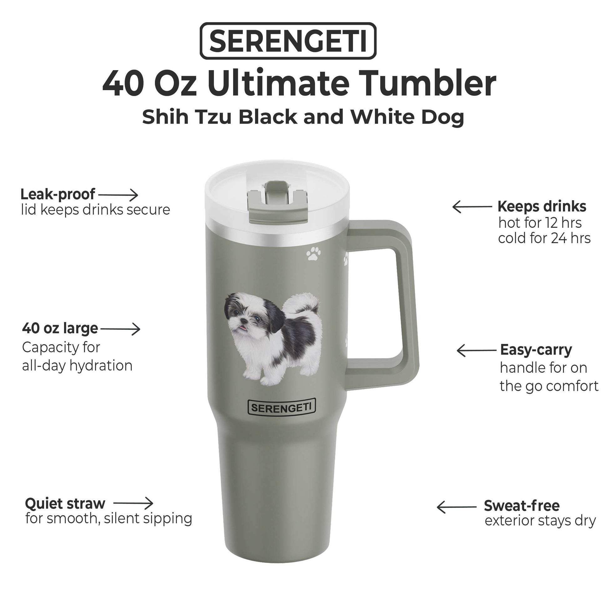 Enjoy your favorite drinks on the go with Shih Tzu, black 40 Oz insulated Tumbler with with straw and Leak-Proof Lid for Pet Lovers.